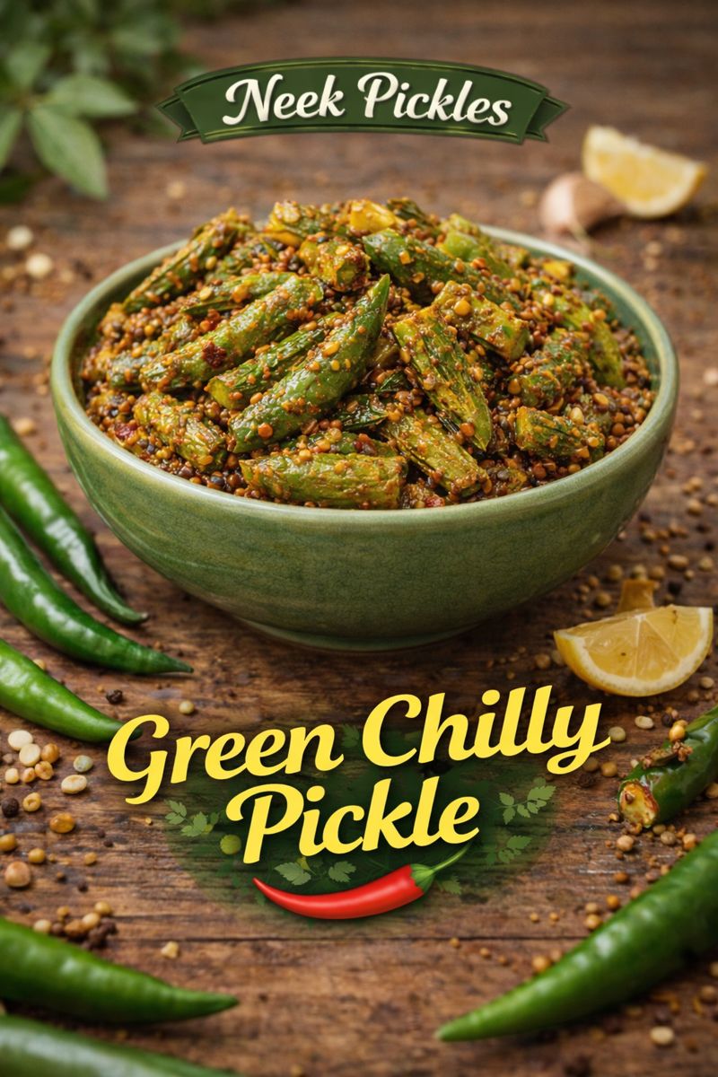 Chili pickles are famous for their fiery taste and are a must-have for spice lovers. Whole green chilies are stuffed with spices like fennel, mustard, and fenugreek before being soaked in mustard oil. This pickle adds a fiery punch to any meal.